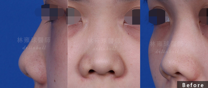 術前的照片,從側面看鼻型可以明顯看出鼻樑的中間位置有明顯的隆起,但看向正面時,高挺的駝峰並沒有為整體的鼻梁的精緻加分,反而讓偏低的山根看起來更加的凹陷,這樣會讓鼻子看起來更大更不符合比例。