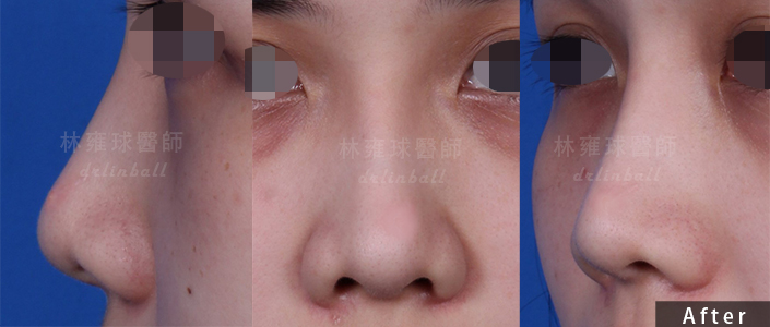 上圖所示,術後的鼻梁已經有高挺且柔和的曲線,正面來看鼻子也不需要鼻影就有顯著的立體度,這樣精緻剛好的鼻型也正符合她的整理臉型五官比例,不需要做到極致就有自然的美感。